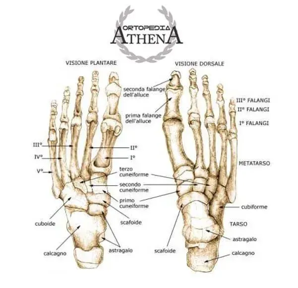 La struttura del piede è un capolavoro unico ed irrepetibile con le sue 26 ossa, 33 articolazioni e 20 muscoli. Formato da due parti definite piede calcaneare o statico composto dal calcagno cuboide, 4° 5° metatarsali e 4° 5° dito e dal piede astragalico o dinamico composto dall'astragalo scafoide, 1° 2° 3° metatarsali e 1° 2° 3° dito.